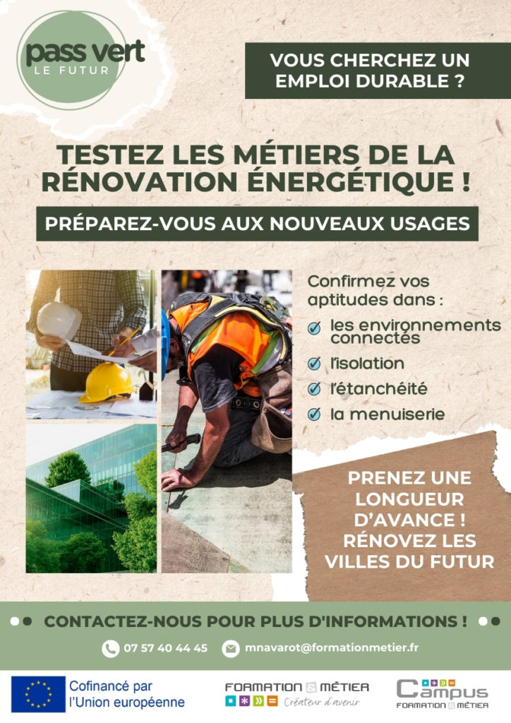 C’est dans cet objectif que Formation et Métier met en place le programme « Pass VERT le Futur ». Ce projet vise à faciliter les reconversions et l’intégration en formation professionnelle des demandeurs d’emploi dans le secteur du bâtiment durable. Avec pour double finalité de réduire le taux de chômage d’une part, et d’autre part de répondre aux besoins de main d’œuvre de ce secteur en pleine mutation.